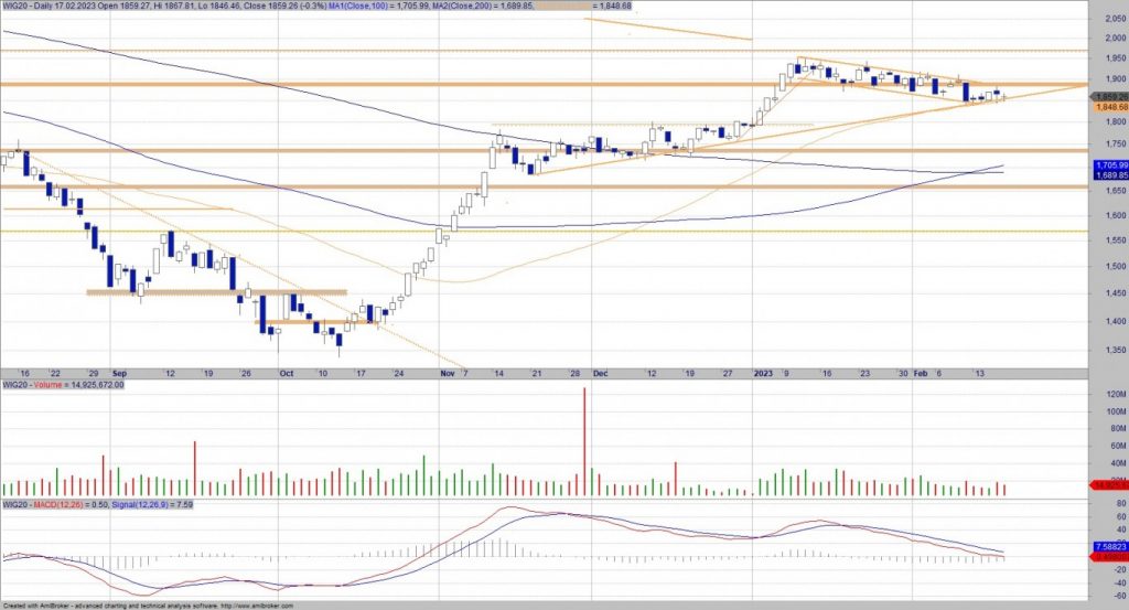 Indeks nadal porusza się nad SMA50 oraz utrzymuje się na linii trendu wzrostowego, rysowanej od listopada ub.r. Przyszły tydzień zdaje się być kluczowy: wybicie EOD 1848 potwierdzi słabość indeksu w średnim terminie…