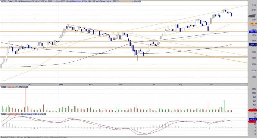 Prospadkowa formacja spadającej gwiazdy, o której pisałem w ostatnim KzK, materializuje się. Teraz najbliższym wsparciem jest 2020 pkt, później 1963 (SMA50), 1950 i bardzo ważne na 1900 pkt. Jest jeszcze za wcześnie…